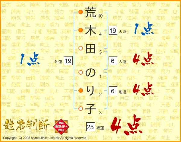 荒(10画)木(4画)田(5画)  の(1画)り(2画)子(3画)