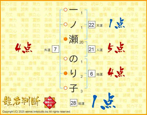 生活面を象徴する運勢です。外部から受ける影響力を表し、結婚運、家庭運や職場、環境への順応性を表します。総運から人運を引いた画数。姓や名が1文字の場合を除く。