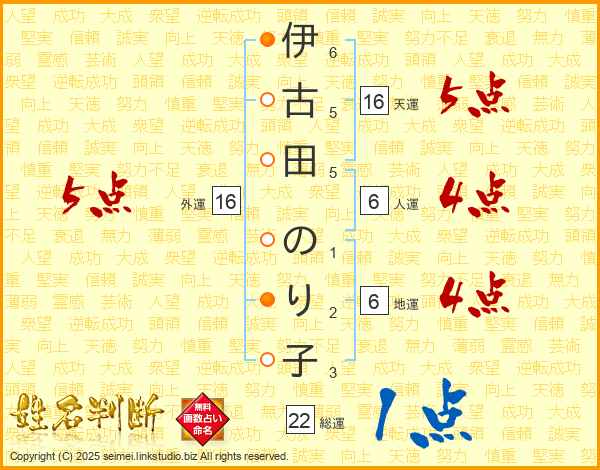 伊(6画)古(5画)田(5画) の(1画)り(2画)子(3画)