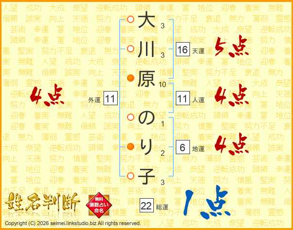 大(3画)川(3画)原(10画) の(1画)り(2画)子(3画)