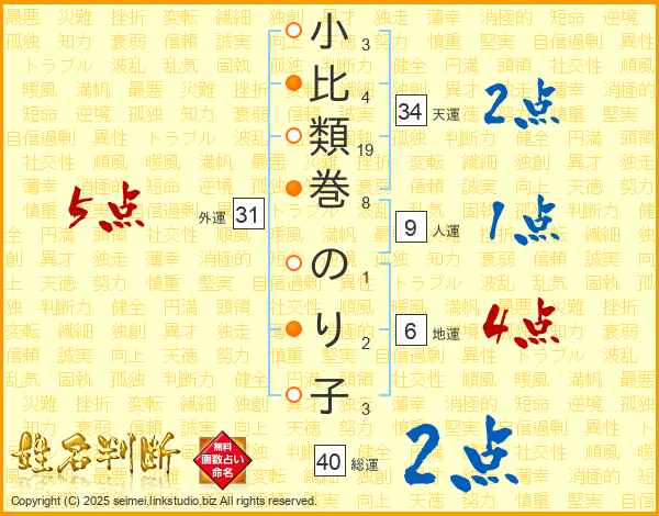小(3画)比(4画)類(19画)巻(8画) の(1画)り(2画)子(3画)