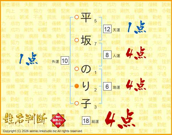 平(5画)坂(7画) の(1画)り(2画)子(3画)