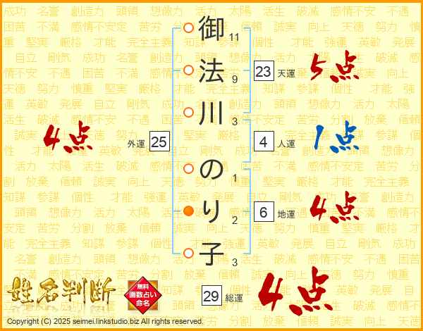 御(11画)法(9画)川(3画) の(1画)り(2画)子(3画)