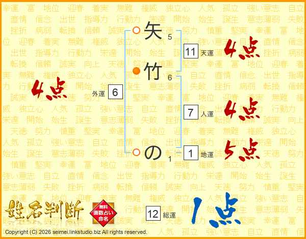 家系が持つ宿命的な運勢を表します。祖先から受け継いだ苗字ですので自分の力が及びません。家柄を象徴します。苗字の合計画数。