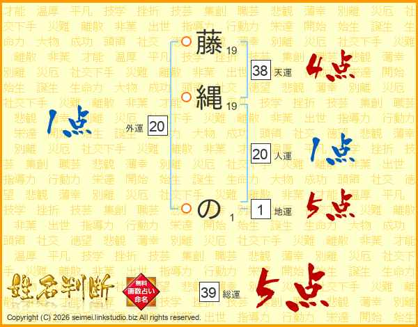 生活面を象徴する運勢です。外部から受ける影響力を表し、結婚運、家庭運や職場、環境への順応性を表します。総運から人運を引いた画数。姓や名が1文字の場合を除く。