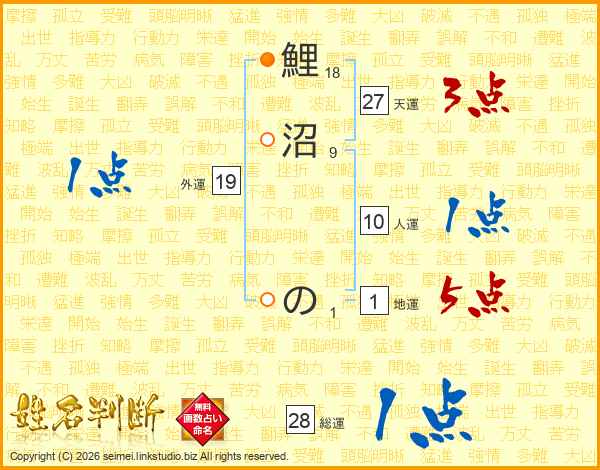 鯉沼のさんの総運は28画の1点!