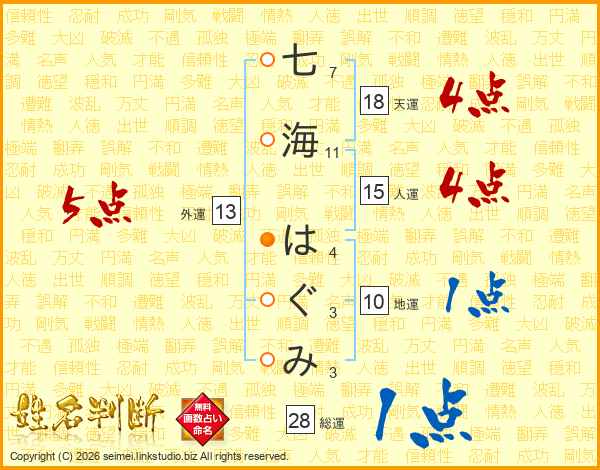 七(7画)海(11画) は(4画)ぐ(3画)み(3画)