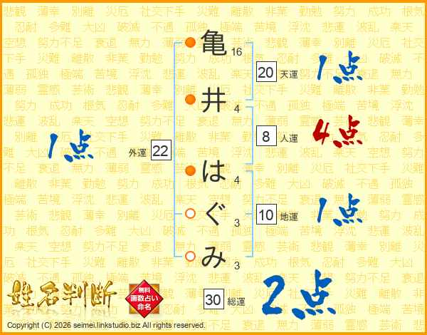 亀(16画)井(4画) は(4画)ぐ(3画)み(3画)