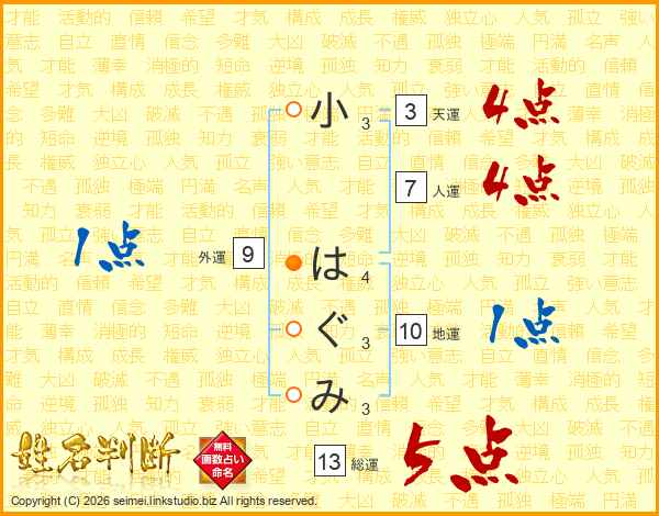 生活面を象徴する運勢です。外部から受ける影響力を表し、結婚運、家庭運や職場、環境への順応性を表します。総運から人運を引いた画数。姓や名が1文字の場合を除く。