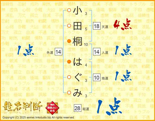 小(3画)田(5画)桐(10画) は(4画)ぐ(3画)み(3画)