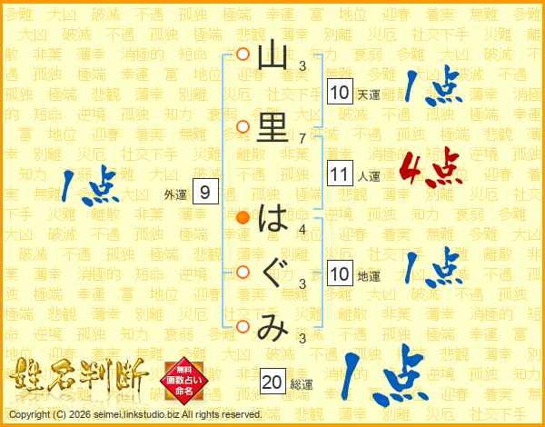 山(3画)里(7画) は(4画)ぐ(3画)み(3画)