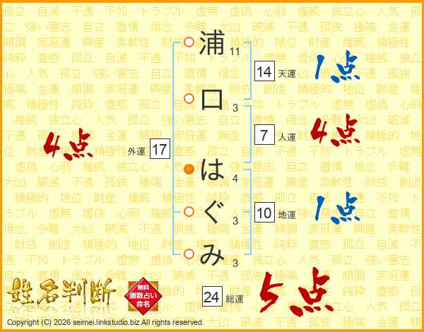 浦(11画)口(3画) は(4画)ぐ(3画)み(3画)