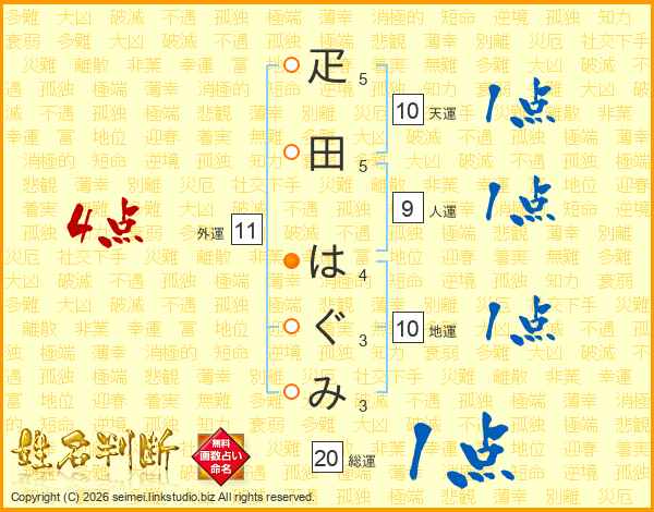 生活面を象徴する運勢です。外部から受ける影響力を表し、結婚運、家庭運や職場、環境への順応性を表します。総運から人運を引いた画数。姓や名が1文字の場合を除く。