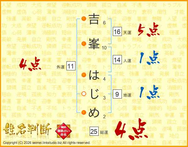 吉(6画)峯(10画) は(4画)じ(3画)め(2画)