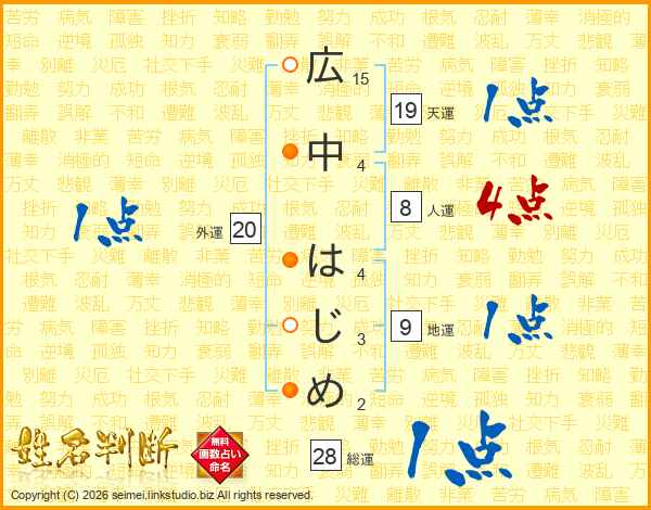 生活面を象徴する運勢です。外部から受ける影響力を表し、結婚運、家庭運や職場、環境への順応性を表します。総運から人運を引いた画数。姓や名が1文字の場合を除く。
