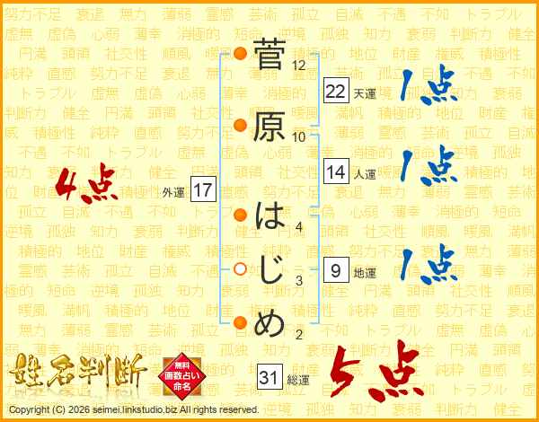 生活面を象徴する運勢です。外部から受ける影響力を表し、結婚運、家庭運や職場、環境への順応性を表します。総運から人運を引いた画数。姓や名が1文字の場合を除く。