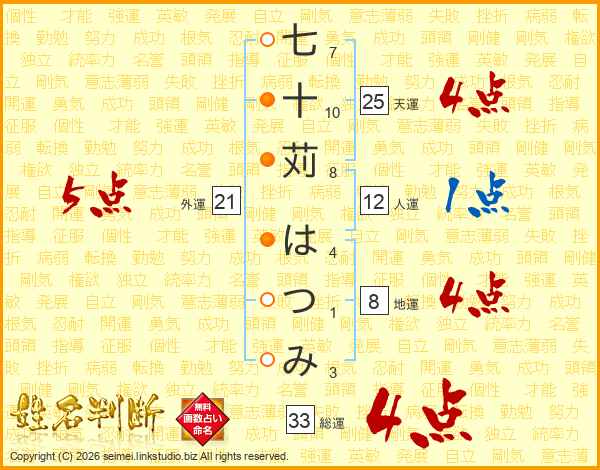 七十苅はつみさんの総運は33画の4点!