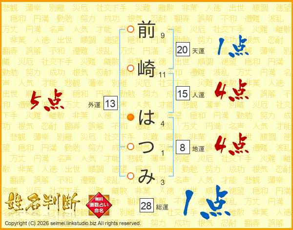 前(9画)崎(11画) は(4画)つ(1画)み(3画)