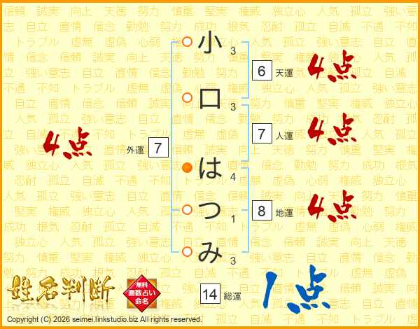 生活面を象徴する運勢です。外部から受ける影響力を表し、結婚運、家庭運や職場、環境への順応性を表します。総運から人運を引いた画数。姓や名が1文字の場合を除く。