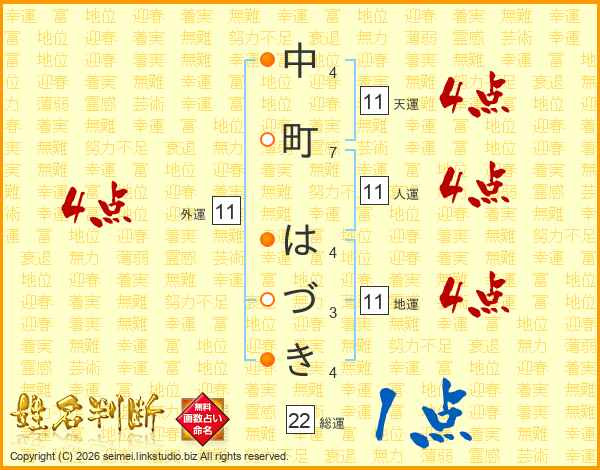 中(4画)町(7画) は(4画)づ(3画)き(4画)