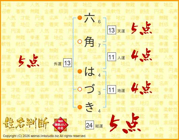 六(6画)角(7画) は(4画)づ(3画)き(4画)