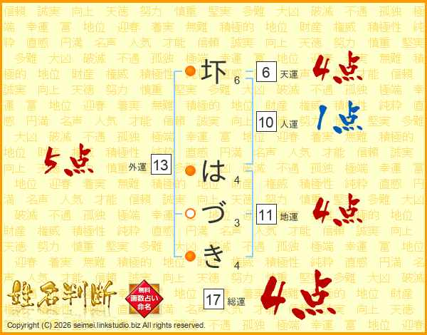 生活面を象徴する運勢です。外部から受ける影響力を表し、結婚運、家庭運や職場、環境への順応性を表します。総運から人運を引いた画数。姓や名が1文字の場合を除く。