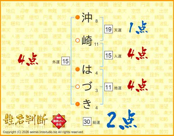 沖(8画)崎(11画) は(4画)づ(3画)き(4画)