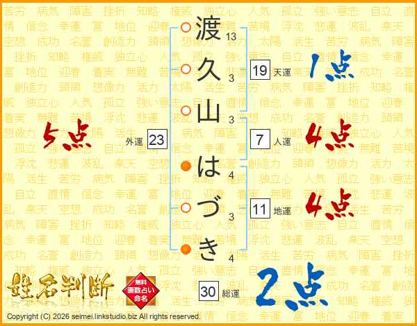 渡(13画)久(3画)山(3画) は(4画)づ(3画)き(4画)