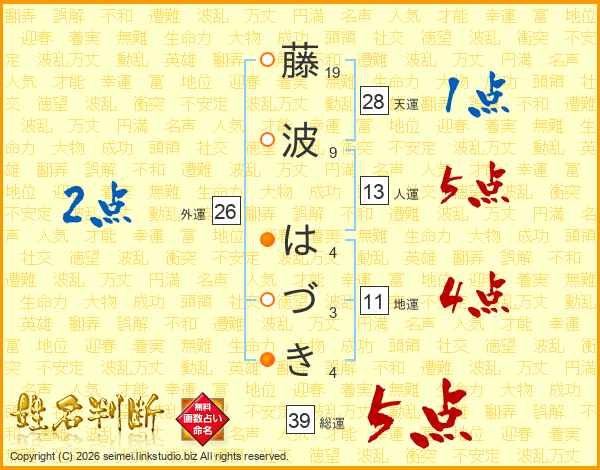 藤(19画)波(9画) は(4画)づ(3画)き(4画)