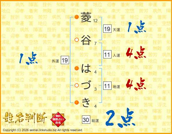 菱(12画)谷(7画) は(4画)づ(3画)き(4画)