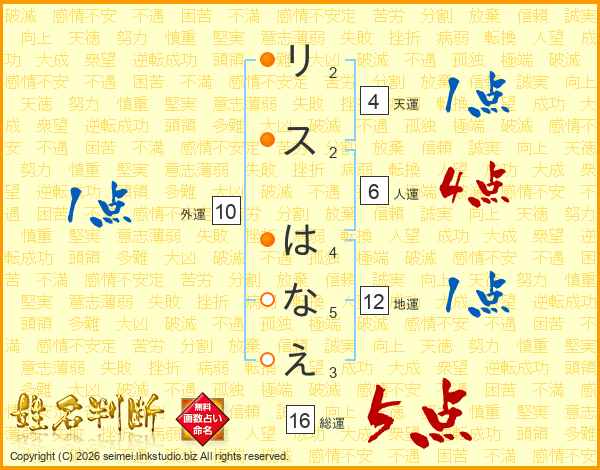 リ(2画)ス(2画) は(4画)な(5画)え(3画)