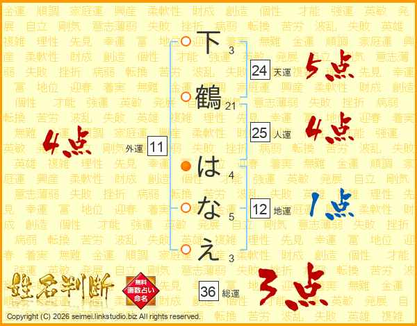 下(3画)鶴(21画) は(4画)な(5画)え(3画)