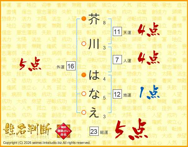 芥(8画)川(3画) は(4画)な(5画)え(3画)