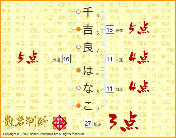千吉良はなこさんの総運は27画の3点!