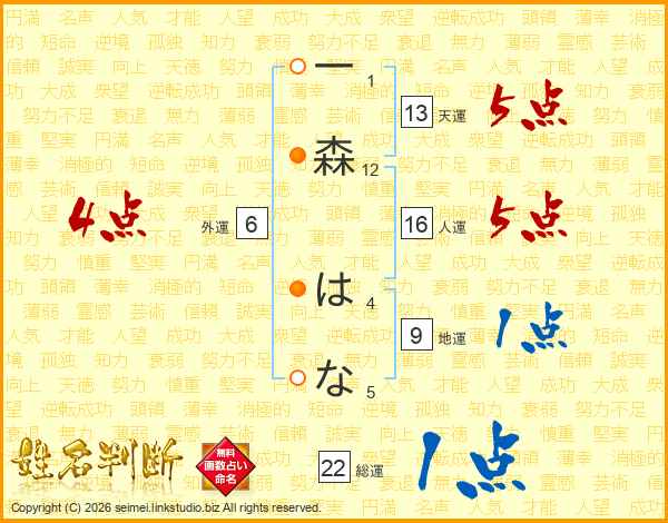 生活面を象徴する運勢です。外部から受ける影響力を表し、結婚運、家庭運や職場、環境への順応性を表します。総運から人運を引いた画数。姓や名が1文字の場合を除く。