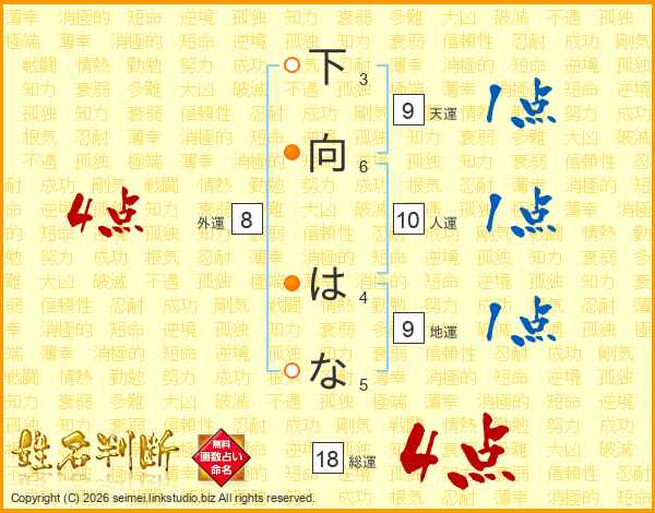 生活面を象徴する運勢です。外部から受ける影響力を表し、結婚運、家庭運や職場、環境への順応性を表します。総運から人運を引いた画数。姓や名が1文字の場合を除く。
