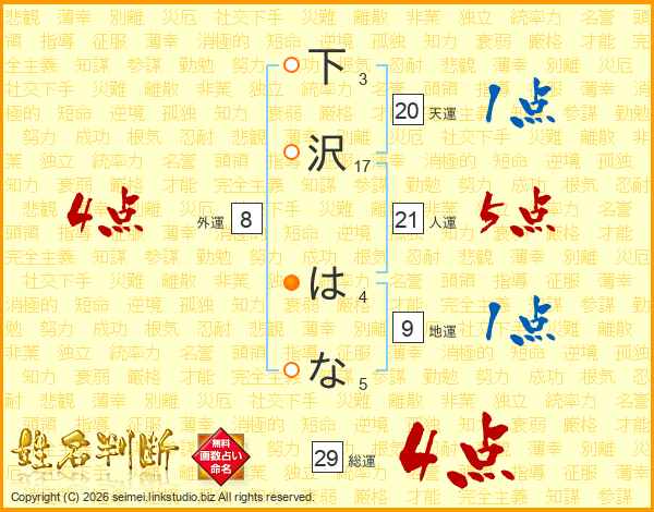 下沢はなさんの総運は29画の4点!