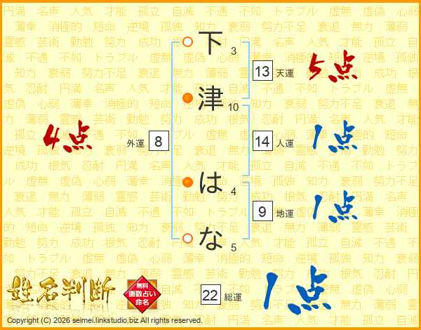 下津はなさんの総運は22画の1点!