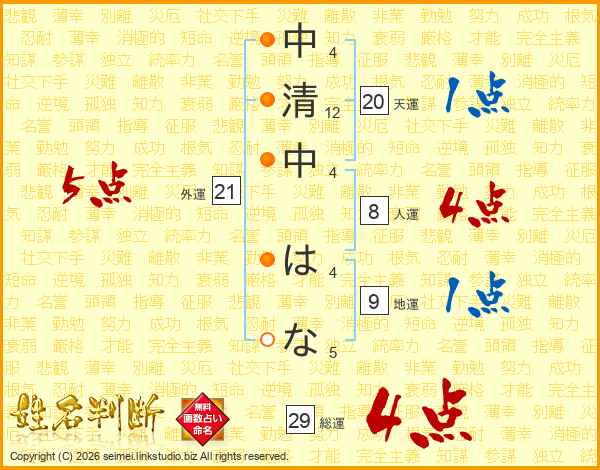 中清中はなさんの総運は29画の4点!