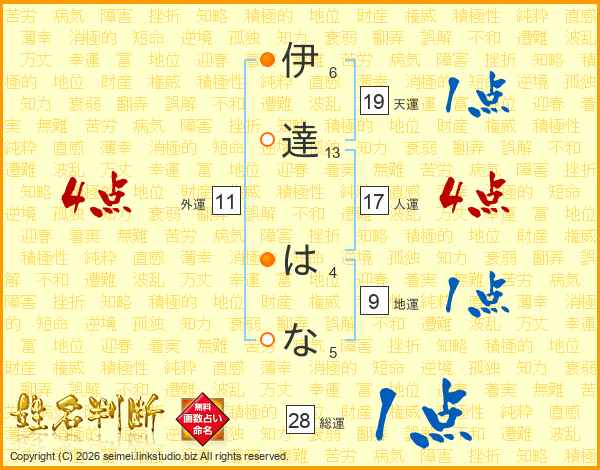 伊達はなさんの総運は28画の1点!