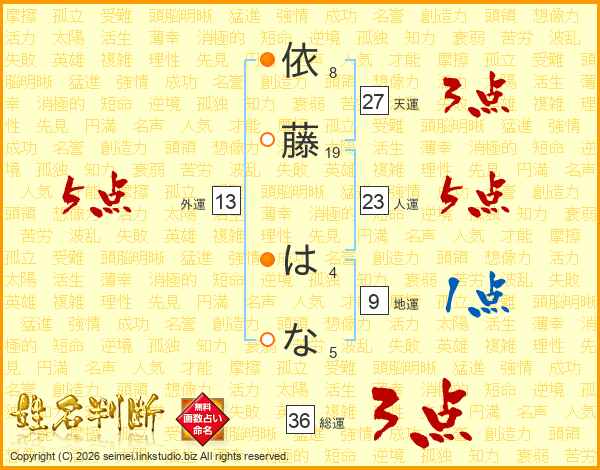 生活面を象徴する運勢です。外部から受ける影響力を表し、結婚運、家庭運や職場、環境への順応性を表します。総運から人運を引いた画数。姓や名が1文字の場合を除く。