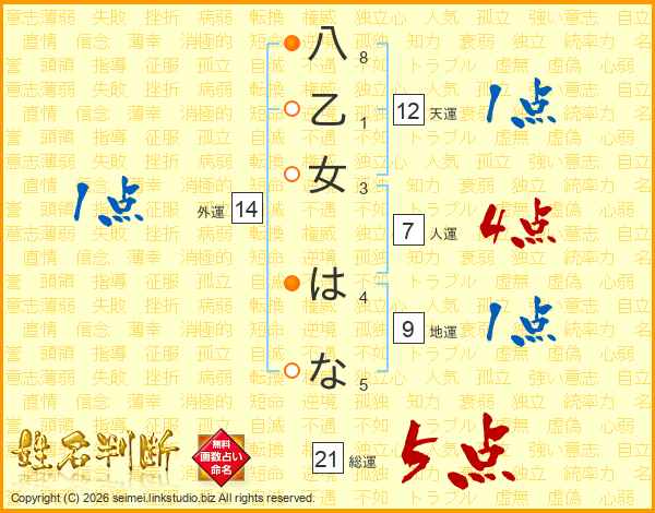 八乙女はなさんの総運は21画の5点!