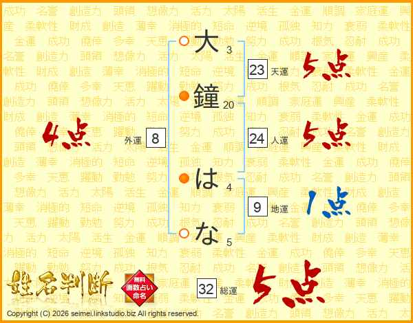 生活面を象徴する運勢です。外部から受ける影響力を表し、結婚運、家庭運や職場、環境への順応性を表します。総運から人運を引いた画数。姓や名が1文字の場合を除く。