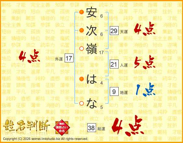 安(6画)次(6画)嶺(17画) は(4画)な(5画)