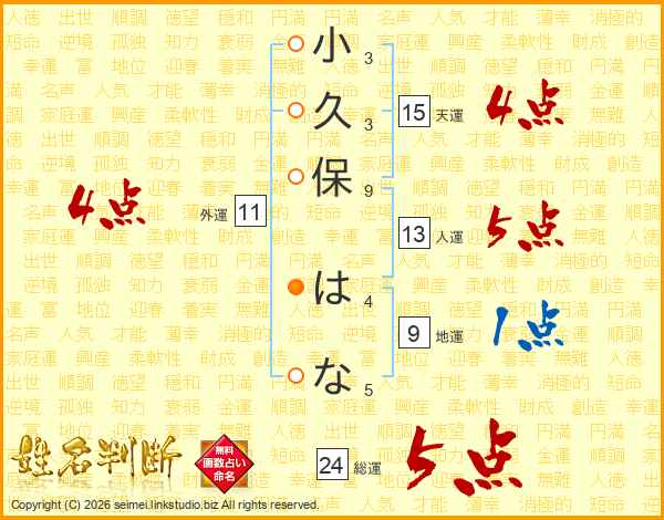 小(3画)久(3画)保(9画) は(4画)な(5画)