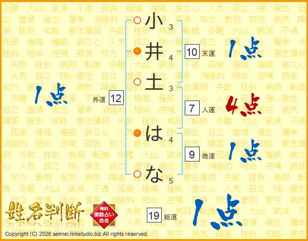 生活面を象徴する運勢です。外部から受ける影響力を表し、結婚運、家庭運や職場、環境への順応性を表します。総運から人運を引いた画数。姓や名が1文字の場合を除く。