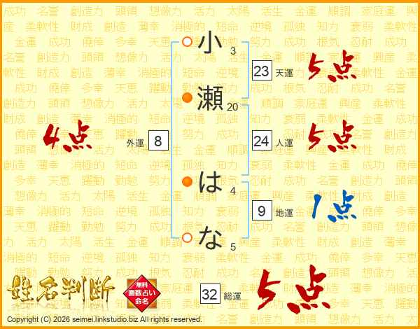 生活面を象徴する運勢です。外部から受ける影響力を表し、結婚運、家庭運や職場、環境への順応性を表します。総運から人運を引いた画数。姓や名が1文字の場合を除く。