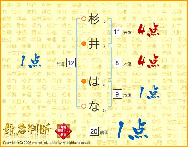 生活面を象徴する運勢です。外部から受ける影響力を表し、結婚運、家庭運や職場、環境への順応性を表します。総運から人運を引いた画数。姓や名が1文字の場合を除く。