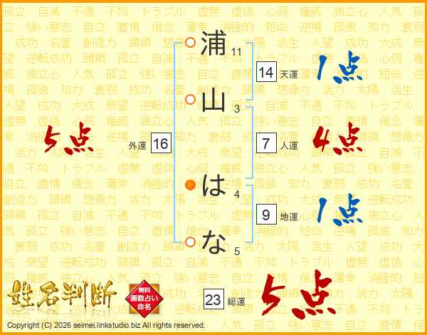 浦山はなさんの総運は23画の5点!