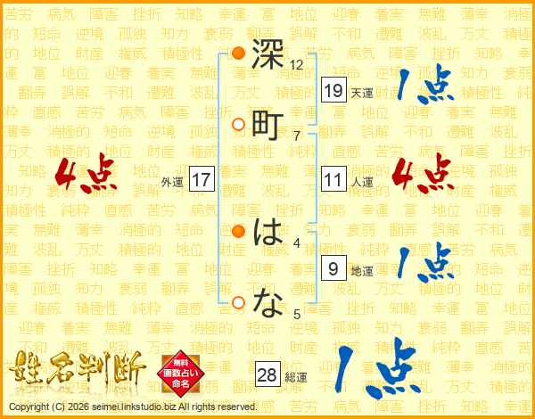 あなたの人生を表す1番重要な運勢です。生涯を通じて影響する総合運となり、主に50歳以降の晩年期に影響を及ぼします。苗字と名前の合計画数。